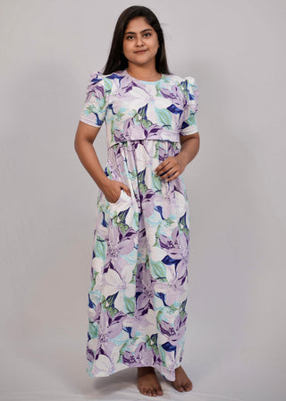 VIOLET FLORAL | ZIPLESS MATERNITY MAXI-PUFF SLEEVES | FULL LENGTH MAXI