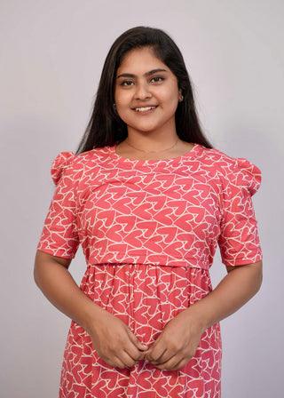 PINK HEARTS | ZIPLESS MATERNITY MAXI-PUFF SLEEVES | FULL LENGTH MAXI
