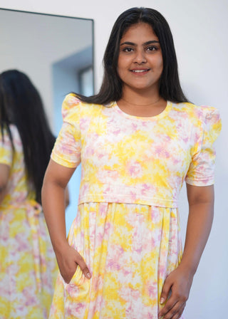 YELLOW WHITE TIE & DYE | ZIPLESS MATERNITY MAXI-PUFF SLEEVES | FULL LENGTH MAXI