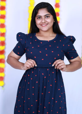BLUE RED HEART | ZIPLESS MATERNITY MAXI-PUFF SLEEVES | FULL LENGTH MAXI