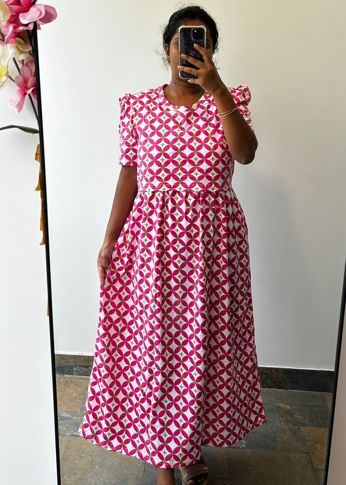 PINK WHITE GEOMETRIC | ZIPLESS MATERNITY MAXI-PUFF SLEEVES | ANKLE LENGTH MAXI