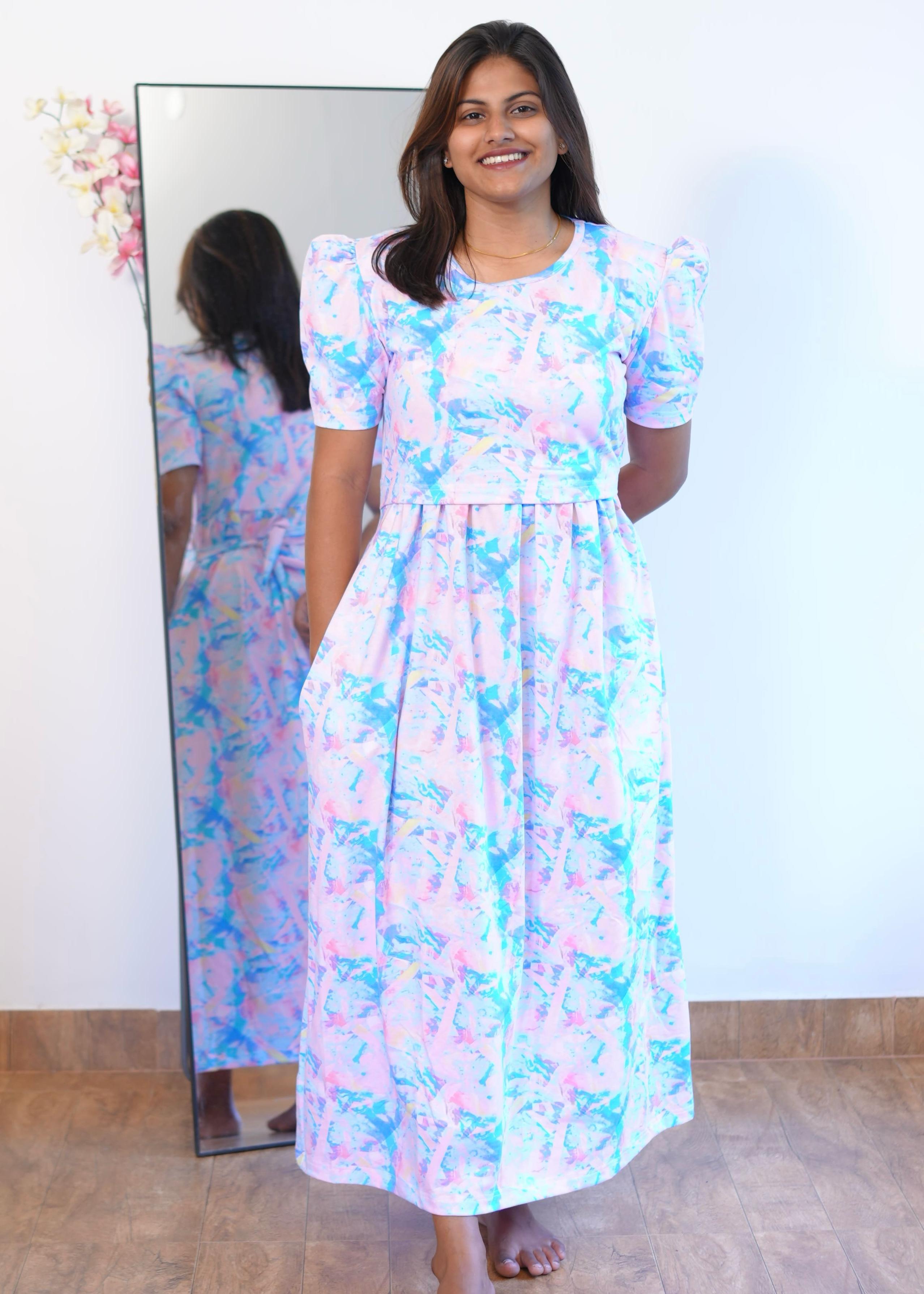 TIE & DYE | ZIPLESS MATERNITY MAXI-PUFF SLEEVES | ANKLE LENGTH MAXI