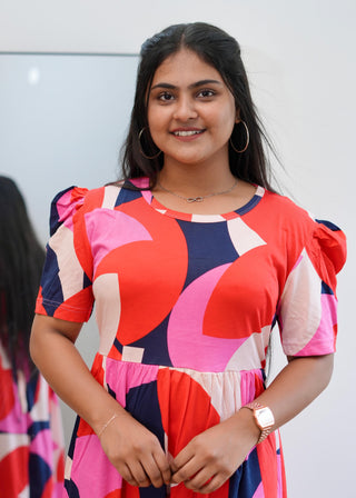 ORANGE PINK GEOMETRIC | ZIPLESS MATERNITY MAXI-PUFF SLEEVES | ANKLE LENGTH MAXI