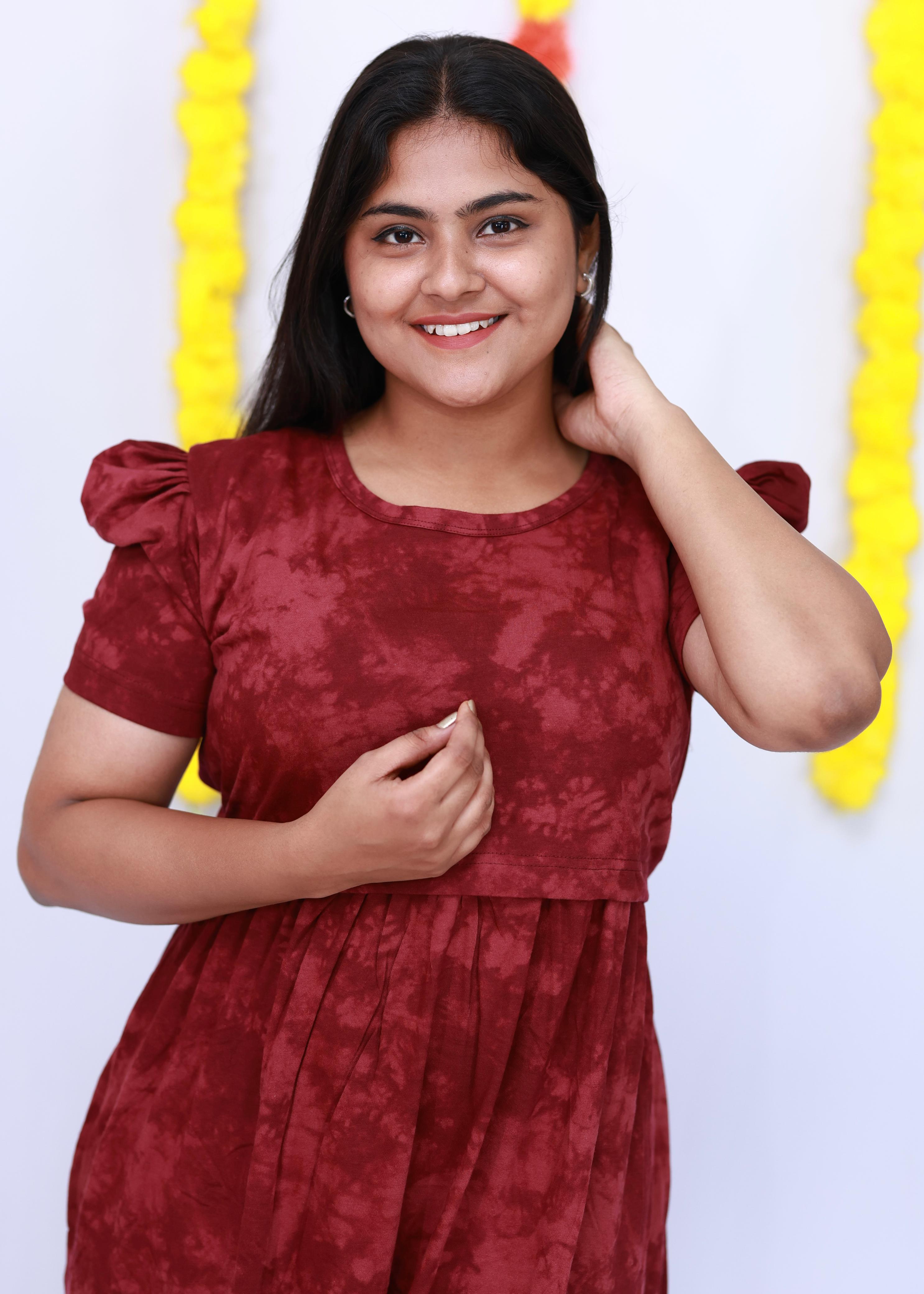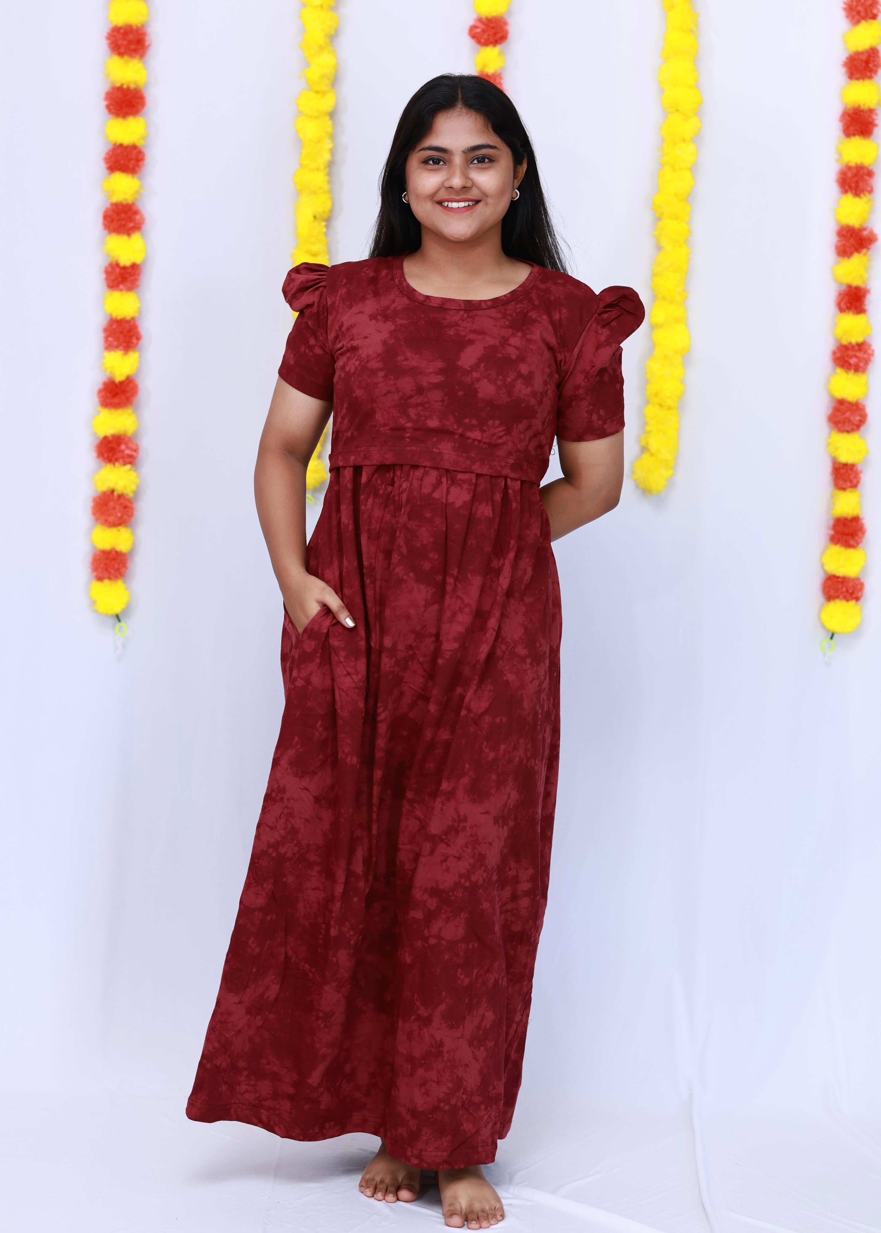 MAROON TIE & DYE | ZIPLESS MATERNITY MAXI-PUFF SLEEVES | FULL LENGTH MAXI