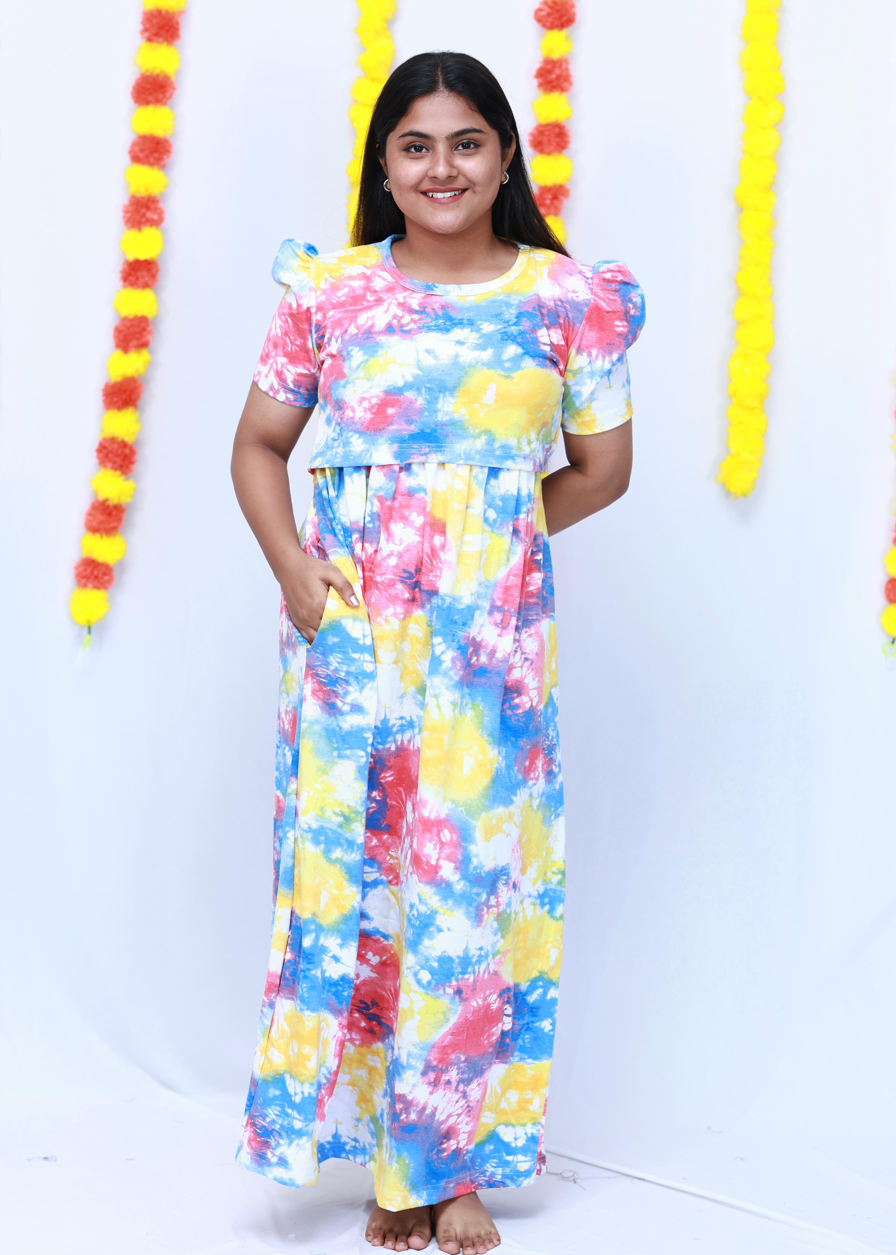 MULTI TIE & DYE | ZIPLESS MATERNITY MAXI-PUFF SLEEVES | FULL LENGTH MAXI