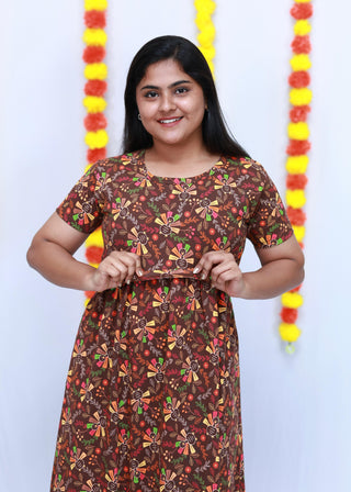 BROWN MULTI FLORAL | ZIPLESS MATERNITY MAXI-SHORT SLEEVES | FULL LENGTH MAXI