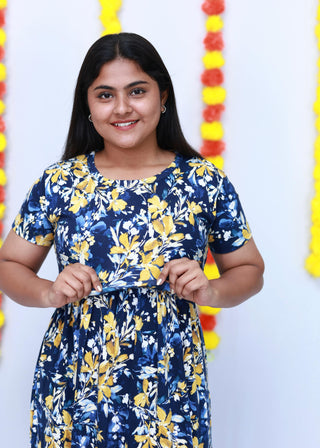 BLUE YELLOW FLORA | ZIPLESS MATERNITY MAXI-SHORT SLEEVES | FULL LENGTH MAXI