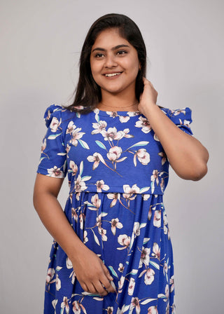BLUE WHITE FLORAL | ZIPLESS MATERNITY MAXI-PUFF SLEEVES | FULL LENGTH MAXI