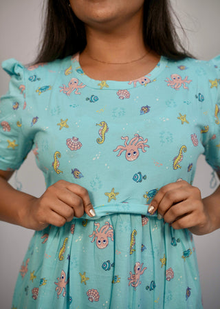 SEA GREEN OCTOPUS | ZIPLESS MATERNITY MAXI-PUFF SLEEVES | FULL LENGTH MAXI