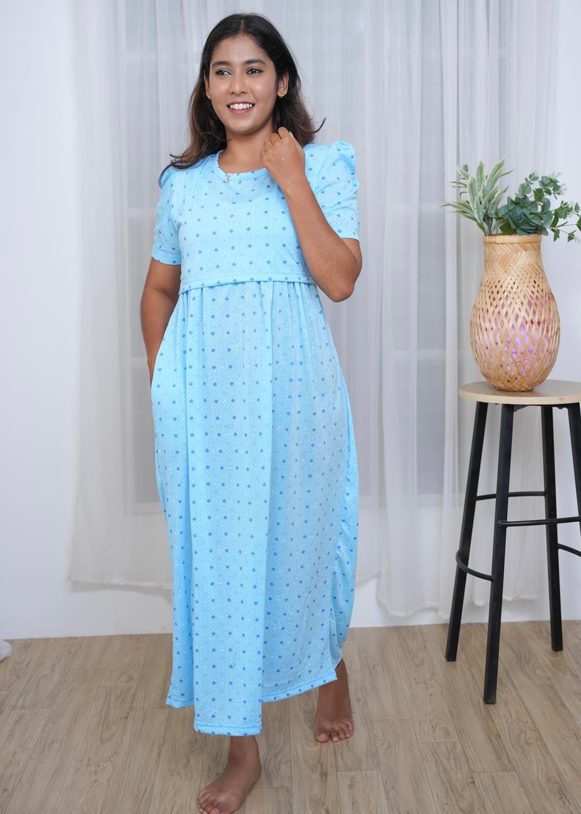 GEOMETRIC BLUE | ZIPLESS MATERNITY MAXI-PUFF SLEEVES | FULL LENGTH MAXI