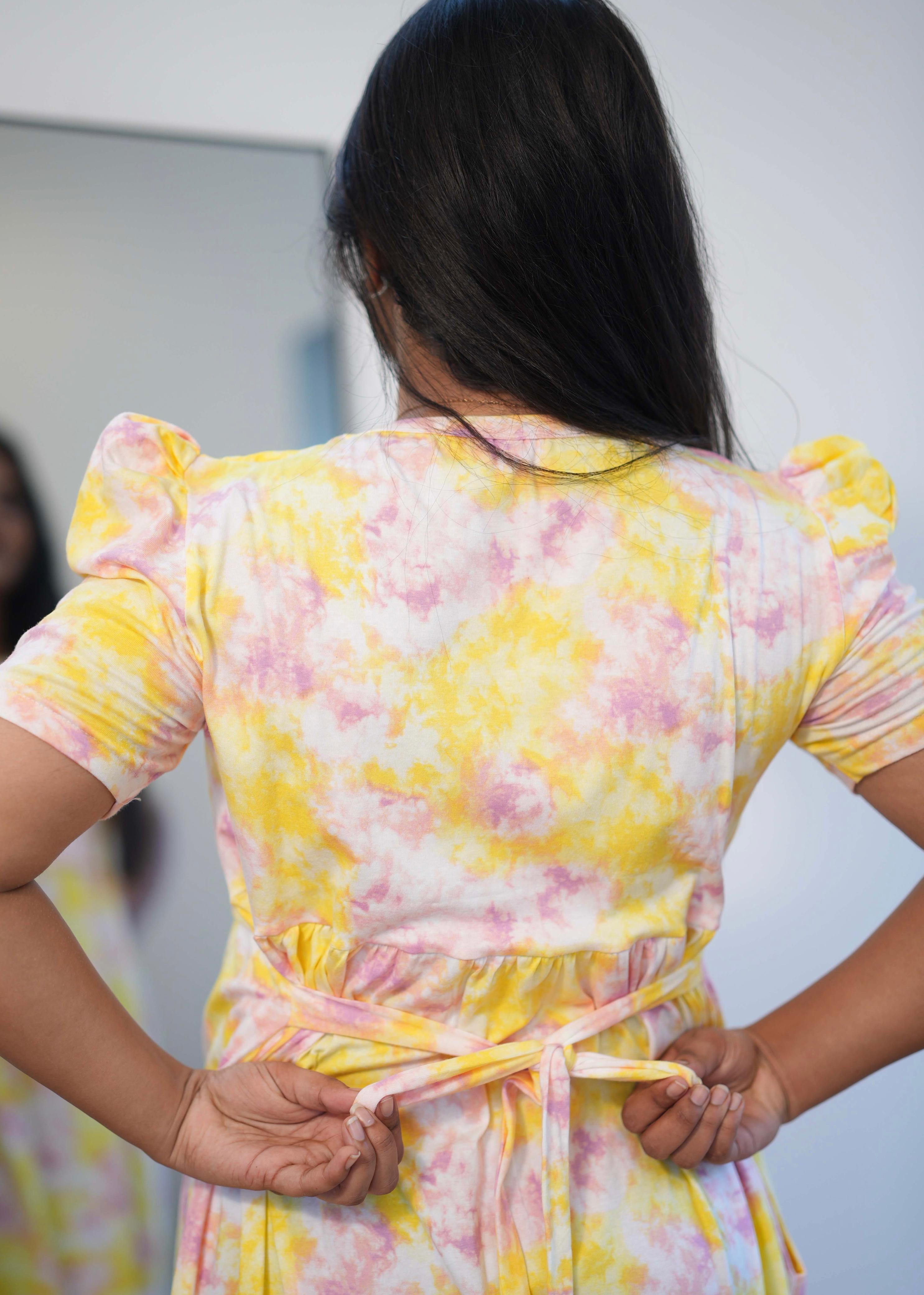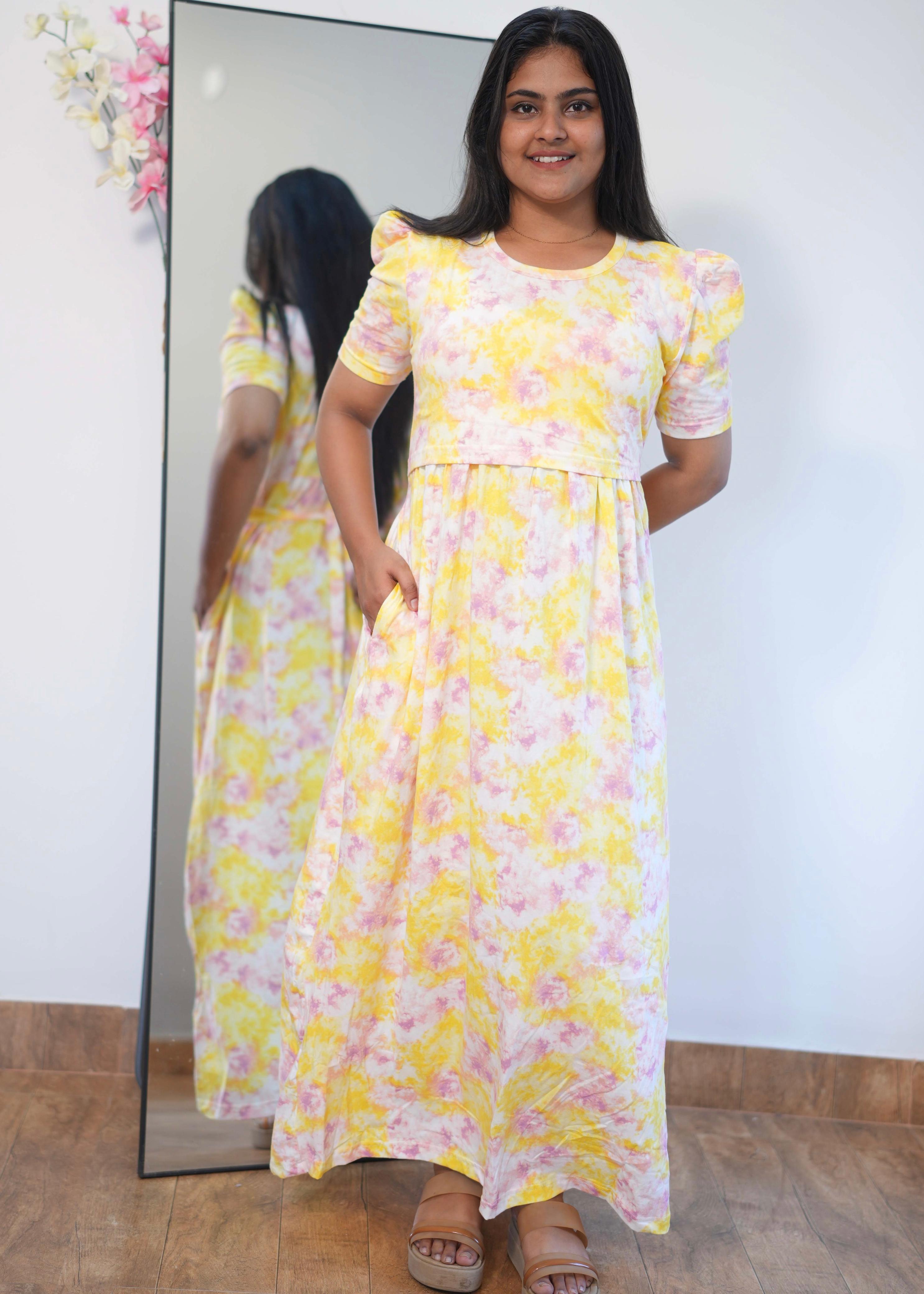 YELLOW WHITE TIE & DYE | ZIPLESS MATERNITY MAXI-PUFF SLEEVES | FULL LENGTH MAXI