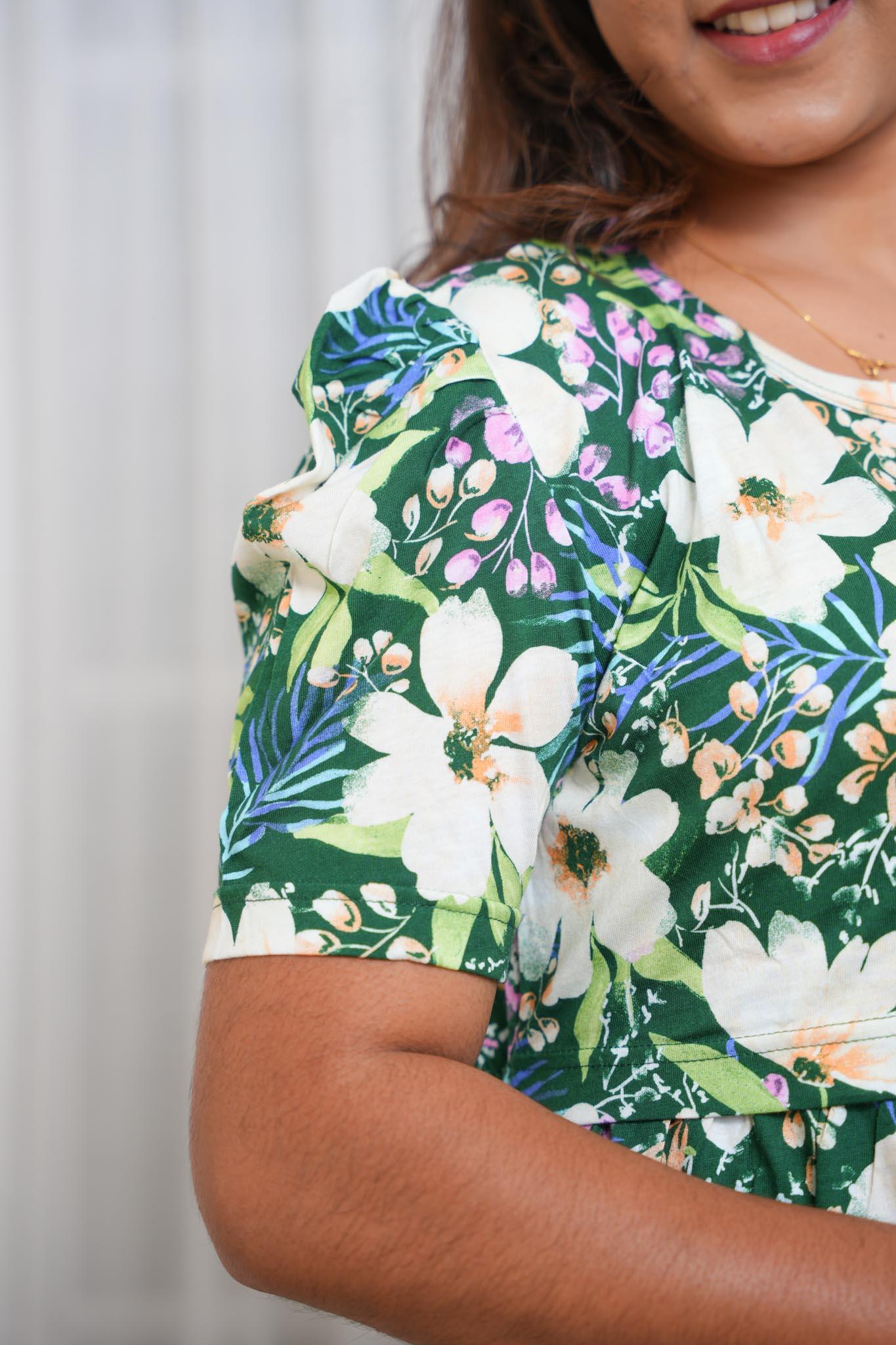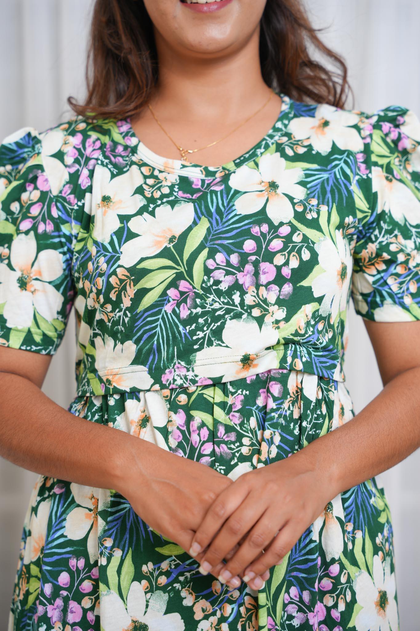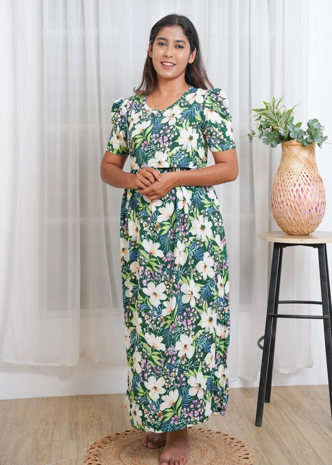 GREEN FLORAL BLOOM | ZIPLESS MATERNITY MAXI-PUFF SLEEVES | FULL LENGTH MAXI