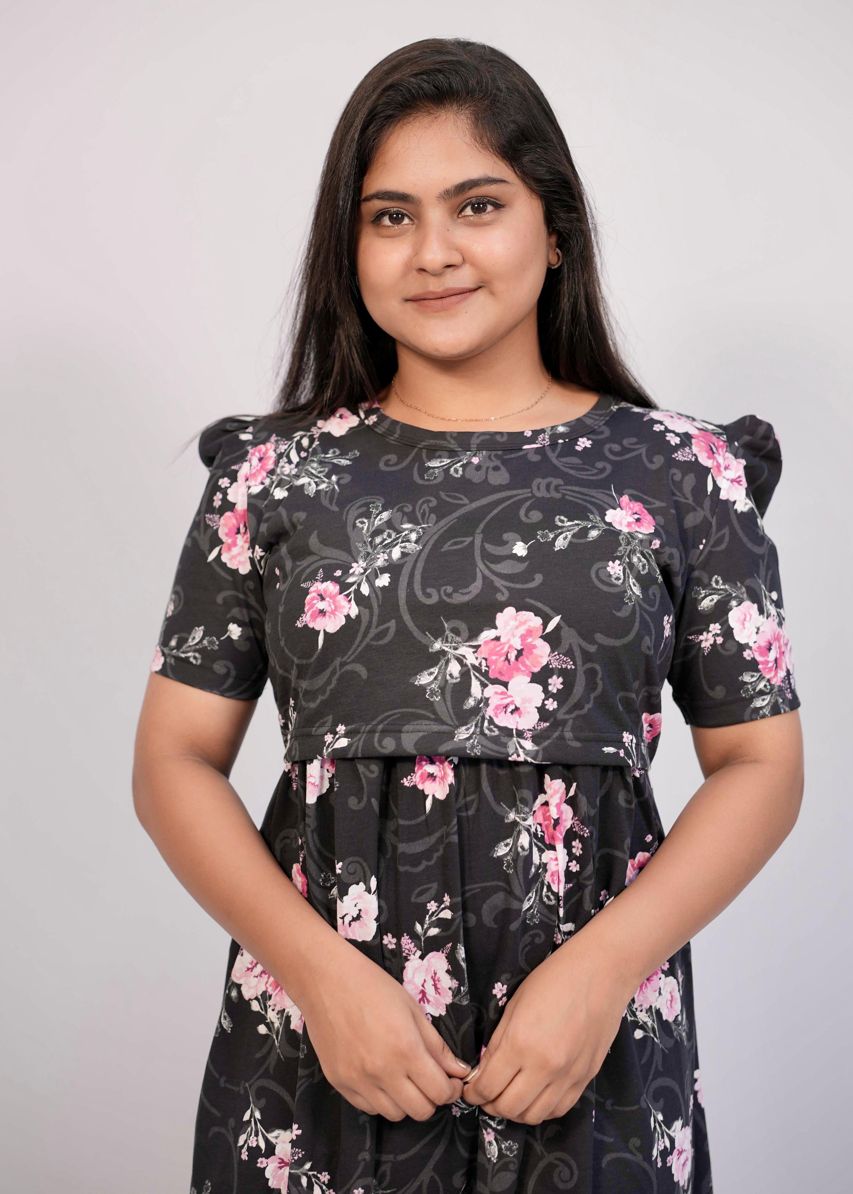 BLACK GAZANIA | ZIPLESS MATERNITY MAXI-PUFF SLEEVES | FULL LENGTH MAXI