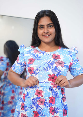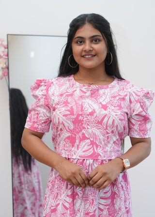 PINK WHITE LEAF | ZIPLESS MATERNITY MAXI-PUFF SLEEVES | ANKLE LENGTH MAXI