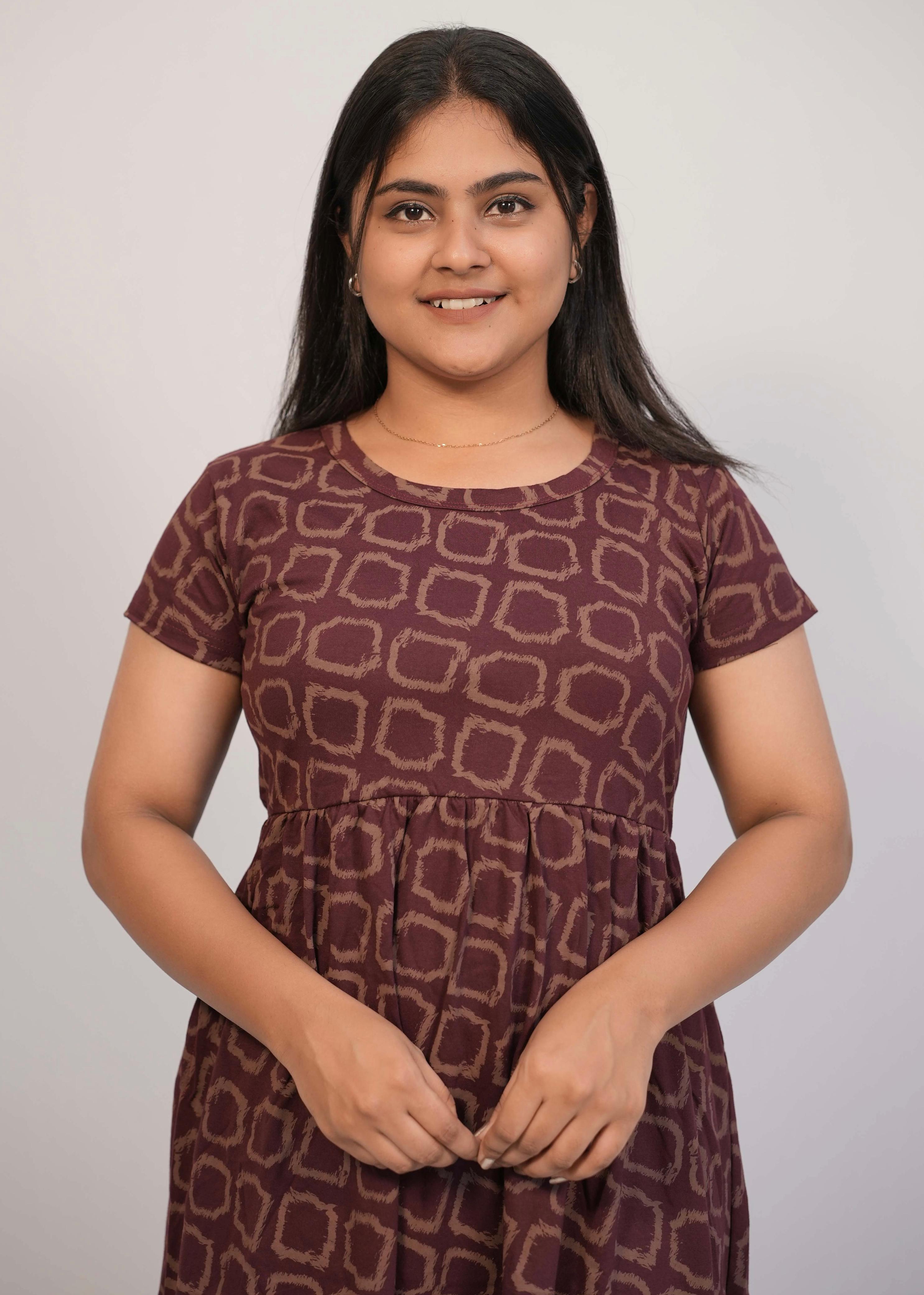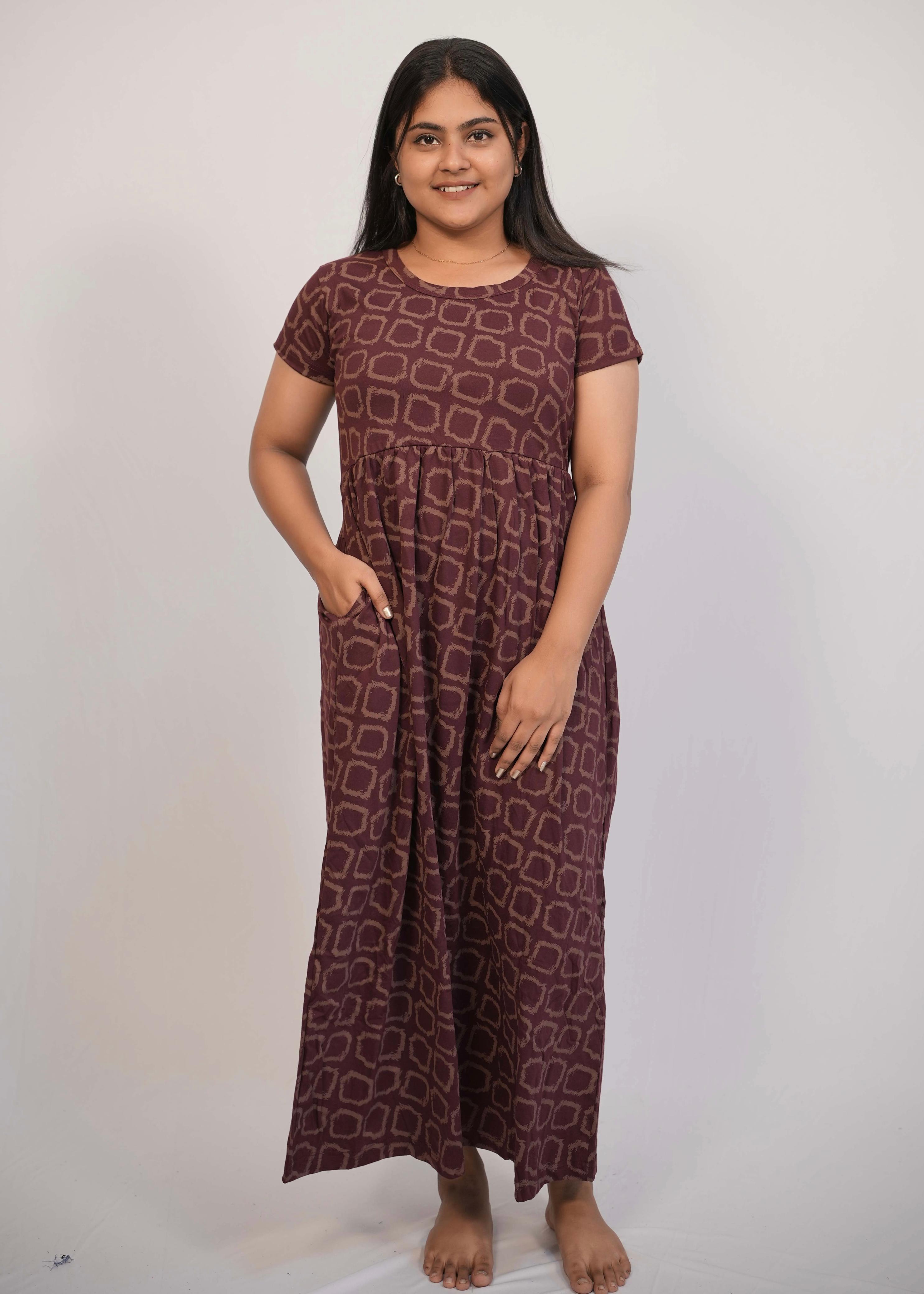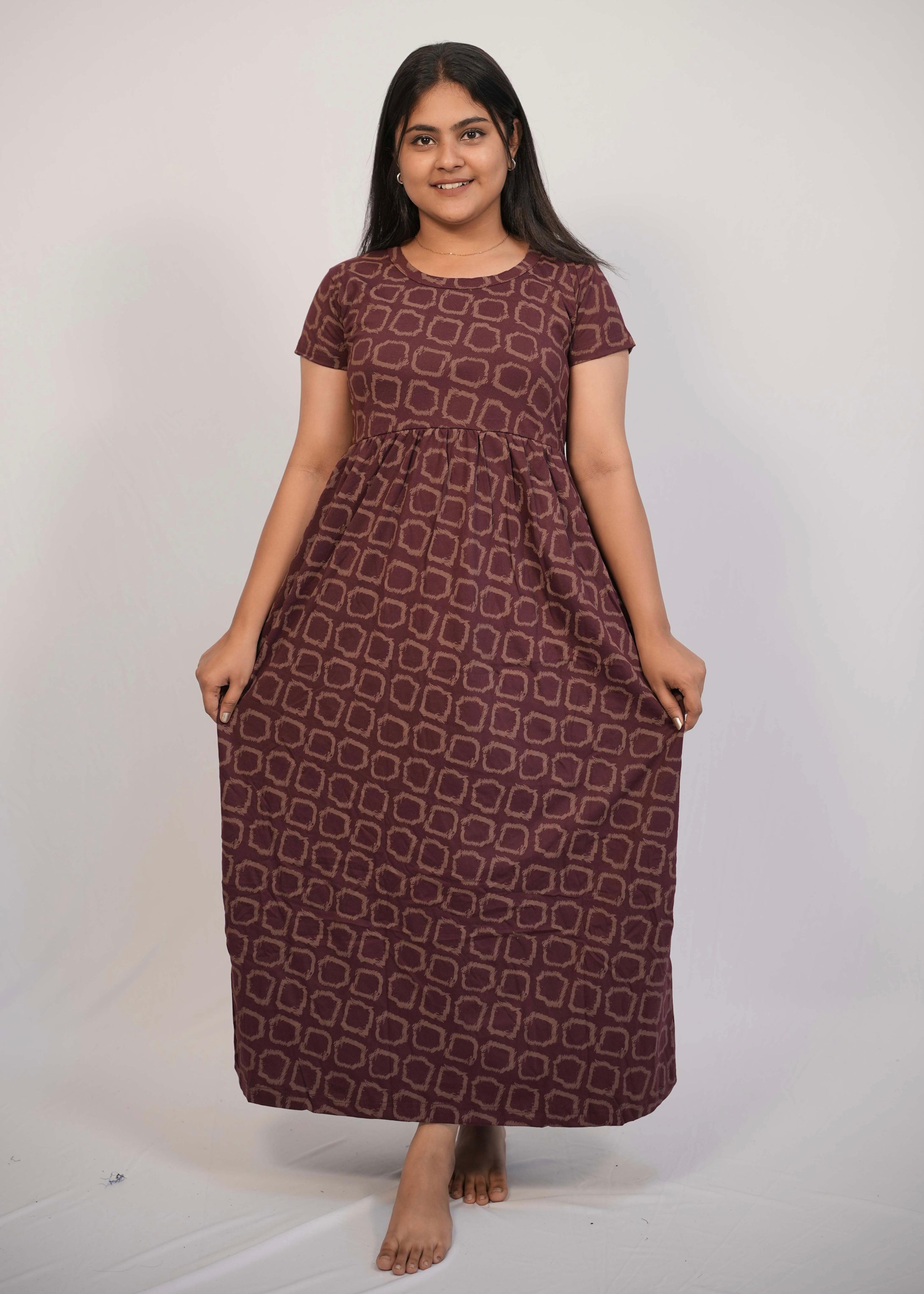MAROON SQUARES | NON-FEEDING MAXI – SHORT SLEEVES | ANKLE LENGTH MAXI