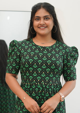 GREEN GLITTERY LEAF | NON-FEEDING MAXI – PUFF SLEEVES | ANKLE LENGTH MAXI