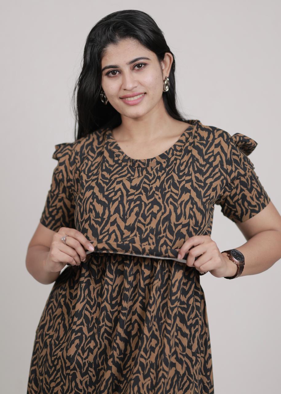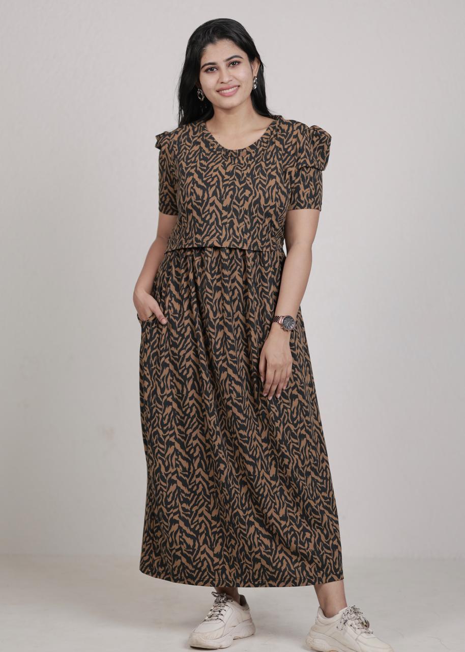 BROWN BLACK CROSS | ZIPLESS MATERNITY MAXI-PUFF SLEEVES | ANKLE LENGTH MAXI